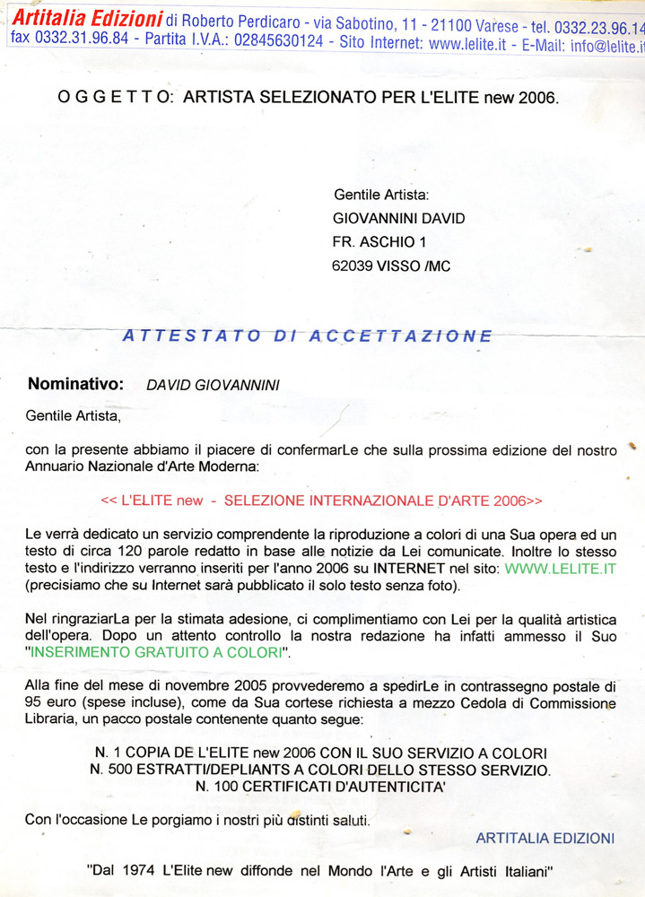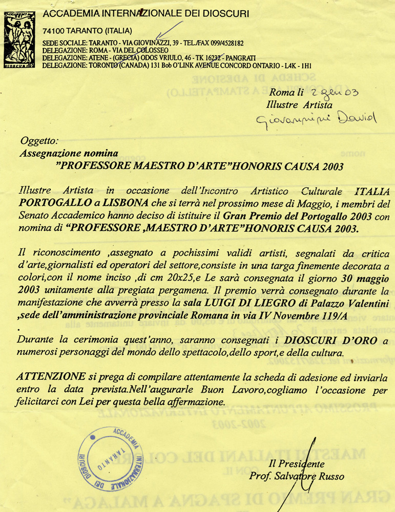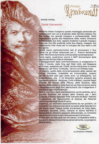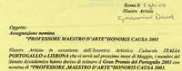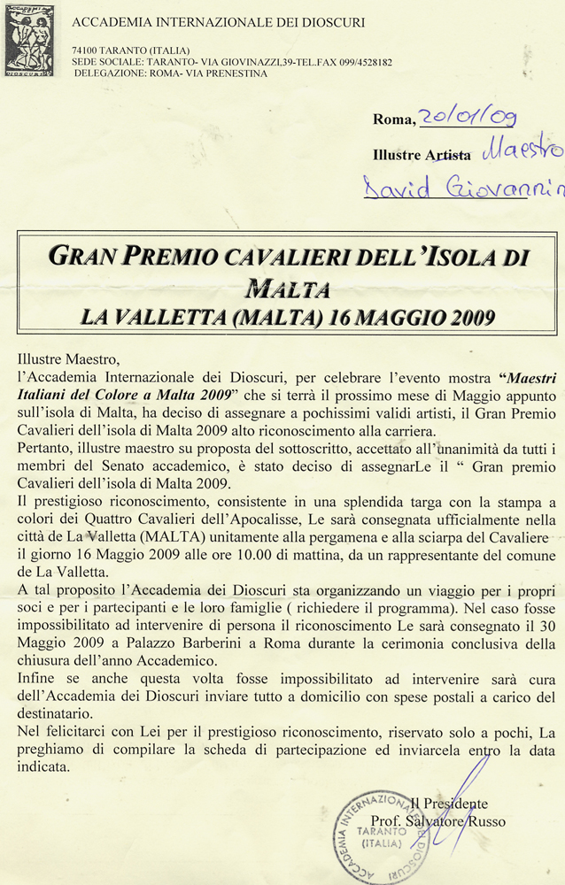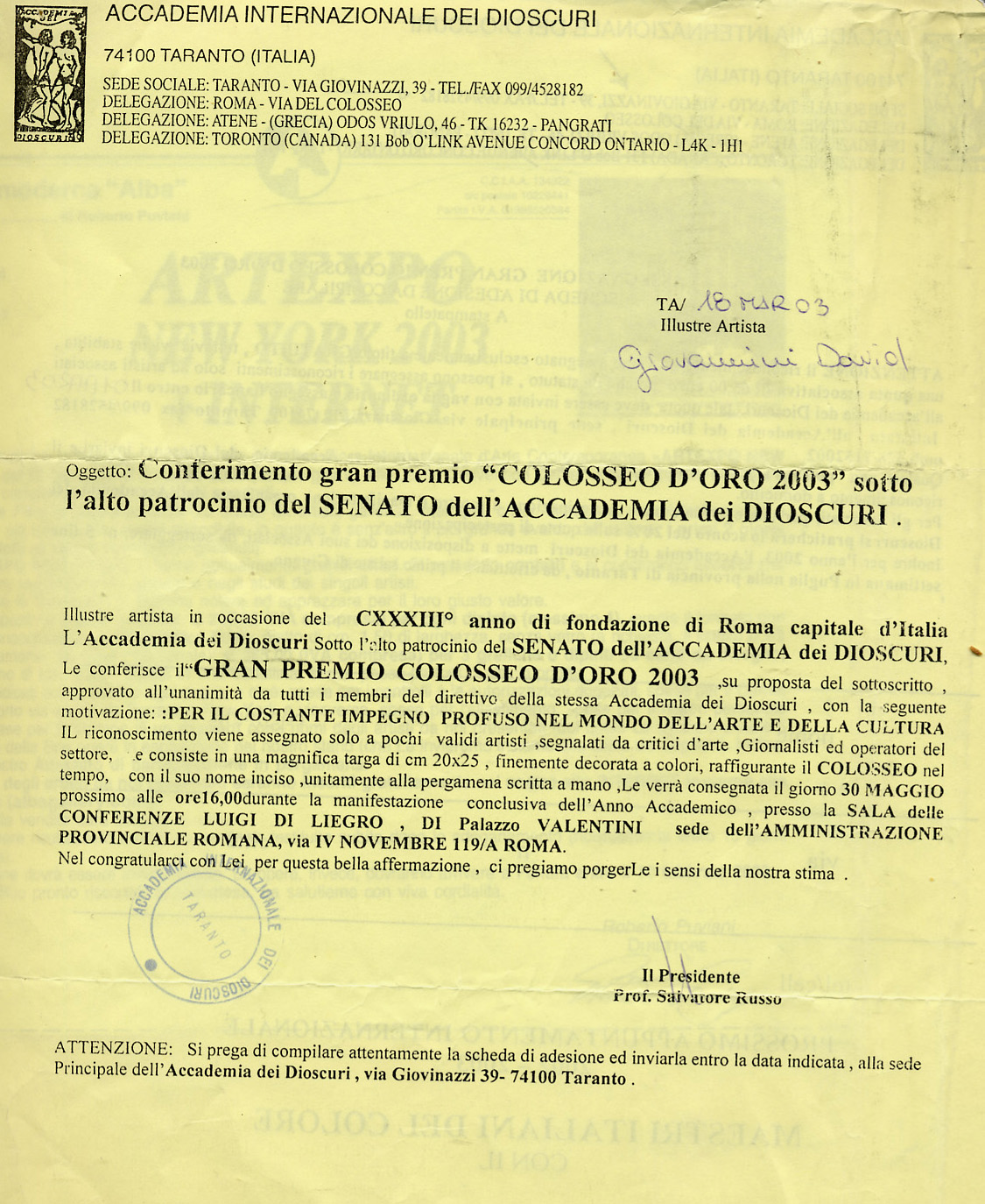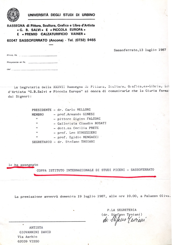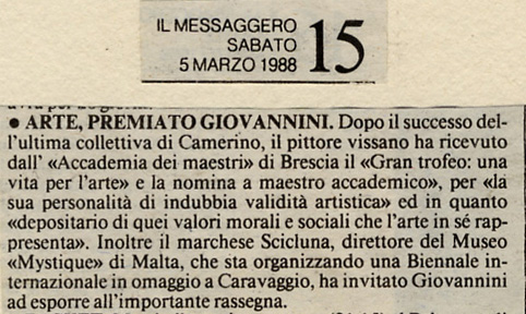 Accademia dei Maestri Brescia marzo 1988 Premio "Gran Trofeo: una vita per l'arte" Invito Biennale internazionale in omaggio a Caravaggio Leggi articolo |